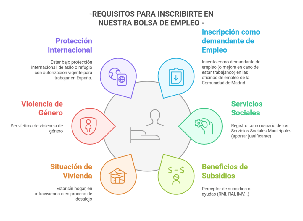 Para inscribirte en nuestra bolsa de empleo debes cumplir y acreditárnoslo con el documento correspondiente, al menos uno de los siguientes condicionantes sociales/personales/laborales: